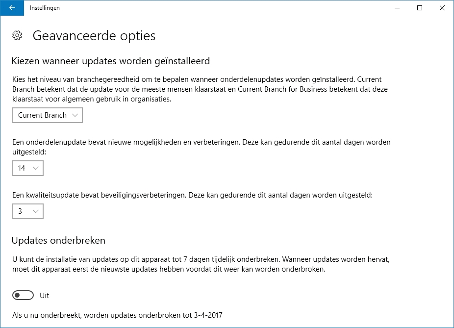 Vanaf de Pro-versie kun je bij de ‘Geavanceerde opties’ van Windows Update instellen dat er een week lang geen updates gedownload mogen worden. Na afloop van die week moet Windows Update per se eerst een keer uitgevoerd worden voordat je hem opnieuw een week kunt uitstellen. Op die manier voorkomt Microsoft dat gebruikers te lang met een ongepatcht systeem blijven werken. Bij previewveries van de Creators Update kon dat nog met een periode van vijf weken. Het is uiteraard niet verstandig om security-updates zo lang uit te stellen.