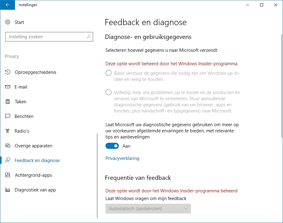 Ook verder verandert er bij versie 1703 aardig wat bij de Instellingen. In het menu ‘Privacy / Taken’ kun je apps wel of geen toegang tot taken geven. Bij ‘Privacy / Diagnostiek van app’ kun je instellen of apps telemetriedata onderling mogen uitwisselen. Bij ‘Privacy / Feedback en diagnose’ is de middelste telemetriedata-optie Uitgebreid verdwenen en kun je alleen nog kiezen uit Basis en Volledig. In een blogartikel van Microsoft-manager Terry Myerson wordt gezegd dat de Creators Update met de instelling Basis minder data naar Microsoft stuurt dan voorheen.