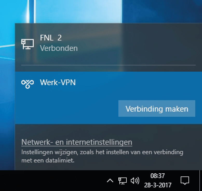 De VPN-verbinding was via de netwerkinformatie bij het pictogram op de Taakbalk wel makkelijk aan te klikken, maar dan opende het VPN-menu de instellingen en moest je nog een keer klikken om de verbinding te maken. Die omweg hoeft nu niet meer. De verbinding met een VPN is rechtstreeks via het snelmenu te maken.
