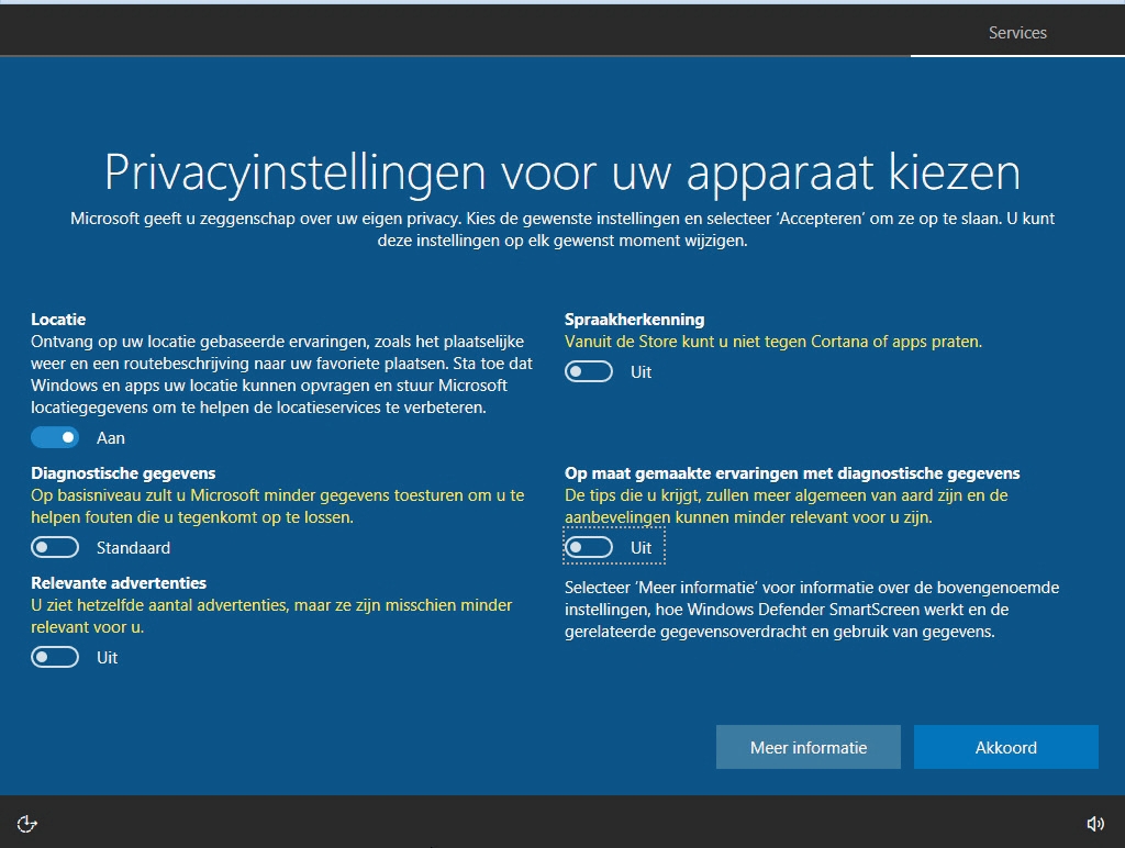 Bij de Creators Update heeft Microsoft de OOBE-dialogen geheel herzien. En komt daarbij gedeeltelijk tegemoet aan privacy-bedenkingen. Alle twijfelachtige opties zijn net als voorheen standaard ingeschakeld, maar die verbergen zich niet meer achter de Express-instellingen. Je krijgt dan ook telkens een lijst te zien van opties met schakelaars. Op andere plekken – bijvoorbeeld bij de vraag of je een Microsoft- of een lokaal account wilt gebruiken – is er inhoudelijk niets gewijzigd.