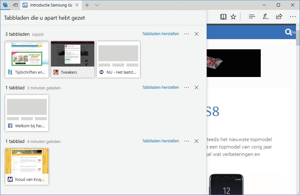 Linksboven zitten twee nieuwe pictogrammen. De rechtse daarvan, ‘Deze tabbladen opzij zetten’, schuift alle openstaande tabbladen opzij om later te lezen en sluit ze dan. Het linker pictogram ‘Tabbladen die u apart heb gezet’ toont de opgeslagen tabbladen in een uitklapmenu, waarmee je ze makkelijk kunt herstellen of verwijderen. In principe gaat het om tijdelijke bookmarks.
