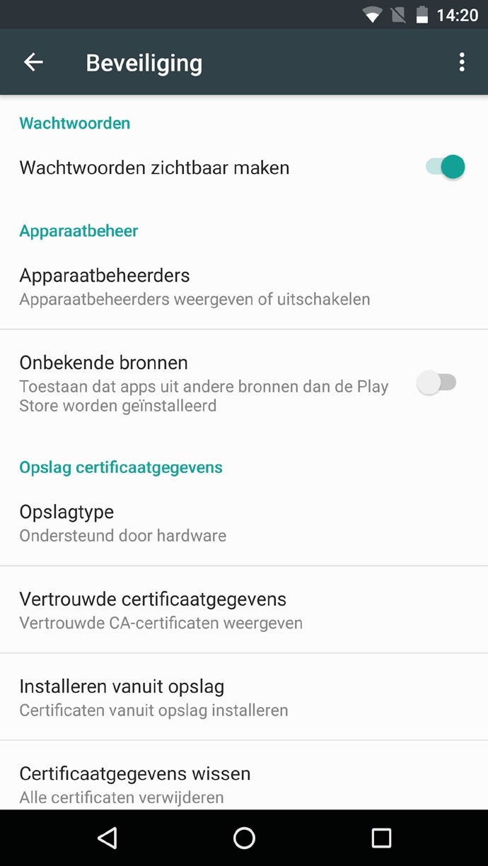 Met de optie ‘Onbekende bronnen’ kun je ook apps installeren die niet in de Play Store staan. Daarmee open je mogelijk de poort voor malware. Je kunt hem dan ook het beste uit laten.