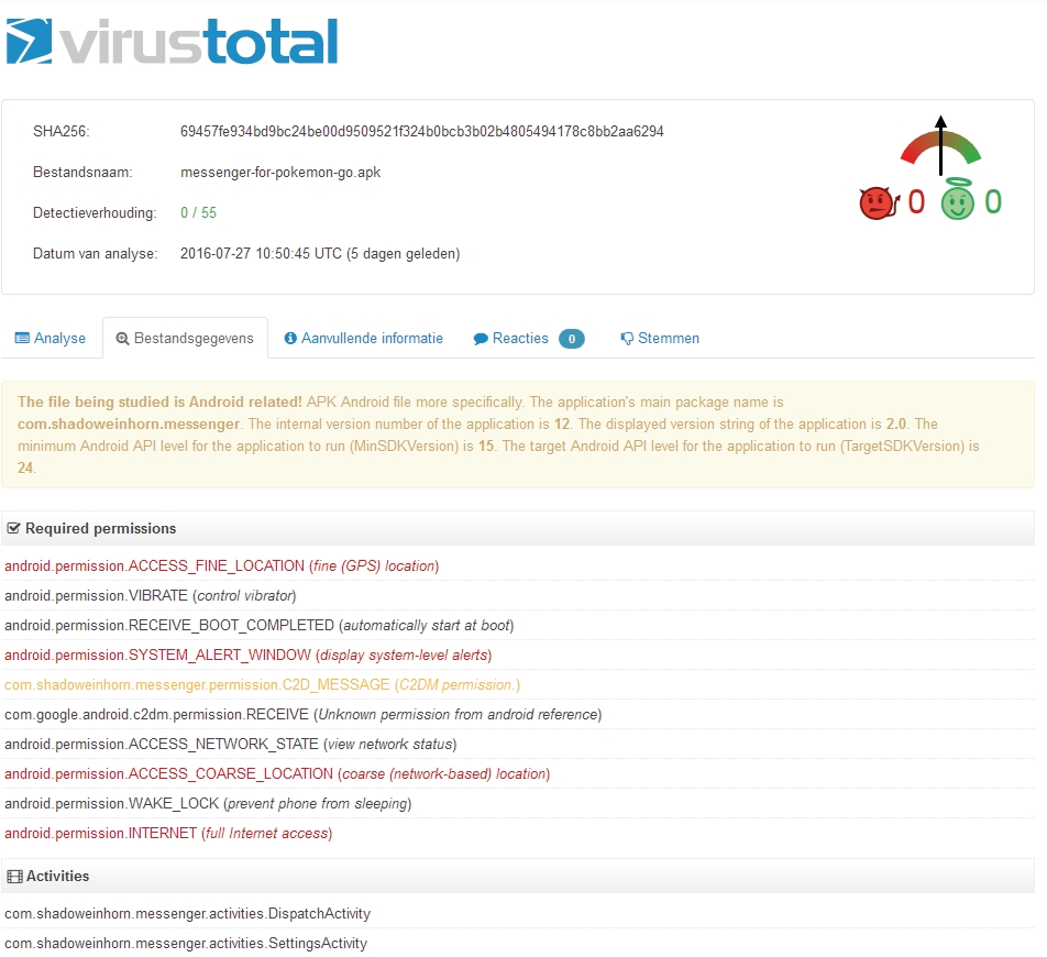 Antivirusservices als VirusTotal kunnen je erop attenderen dat een app bijvoorbeeld de locatie mag opvragen of het internet mag gebruiken.
