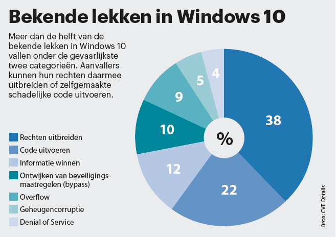 Tot eind 2016 telde database CVE Details 225 lekken in Windows 10. Daarvan kwamen er 172 uit dat jaar. Ruim twintig procent kan door een aanvaller worden benut om code binnen te sluizen. Meer dan een derde kan de rechten uitbreiden om bijvoorbeeld commando’s met administratorrechten uit te voeren terwijl het actieve gebruikersaccount beperkte rechten heeft. De echte hoeveelheid gevonden malware ligt waarschijnlijk nog hoger. In de database staan namelijk alleen lekken met een zogeheten CVE-nummer. Dat is een internationaal erkend identificatienummer waarmee lekken eenduidig kunnen worden toegewezen. Niet elk lek krijgt echter een CVE-nummer.