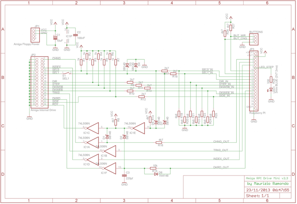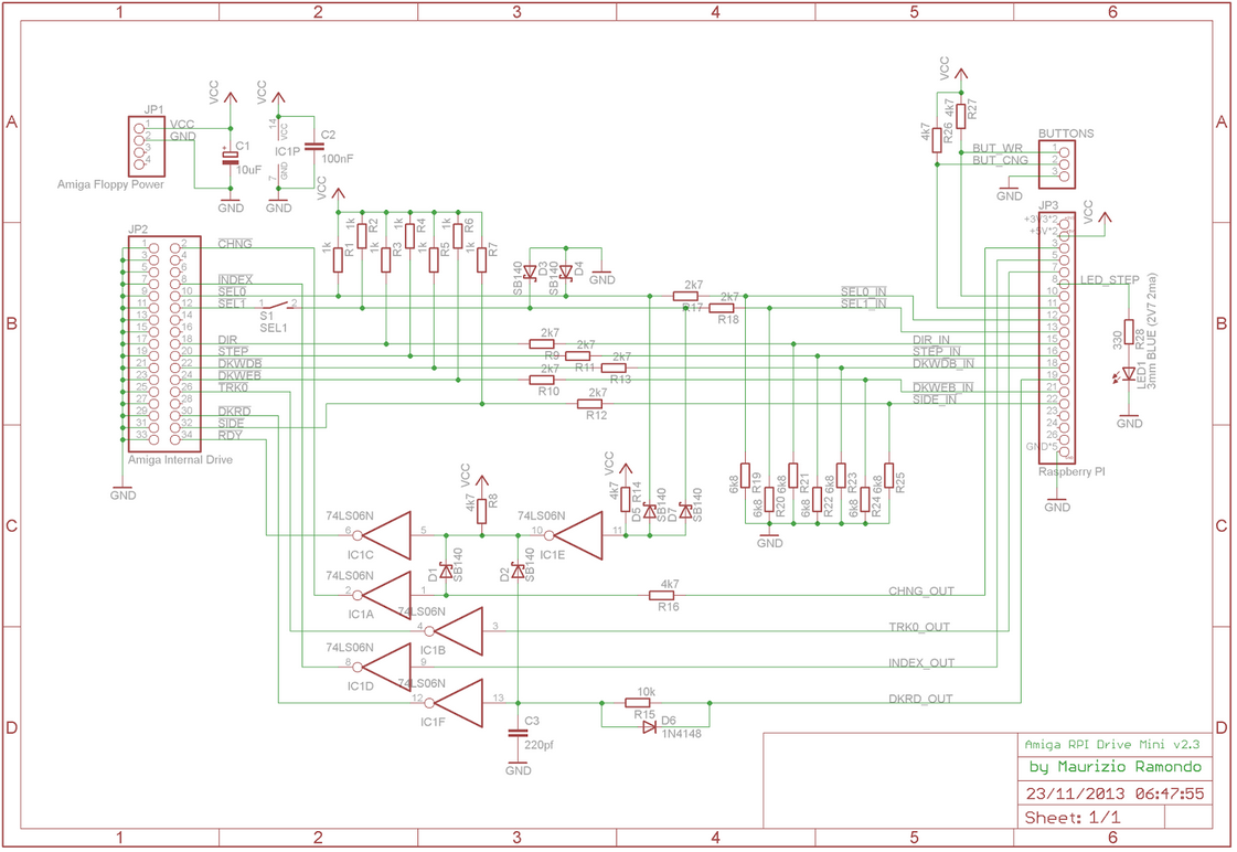 Voor de floppy-emulator verbindt een printplaatje, dat bestaat uit een 74LS06 en enkele passieve componenten, de Raspberry Pi direct met de internen floppy-poort. De RasPi krijgt direct van de floppy stroom geleverd. De Amiga levert met 550 mA eigenlijk te weinig stroomsterkte om de Raspberry Pi (model B) te laten werken, maar volgens Ramondo traden er bij de emulatie vanwege de geringe belasting geen problemen op.