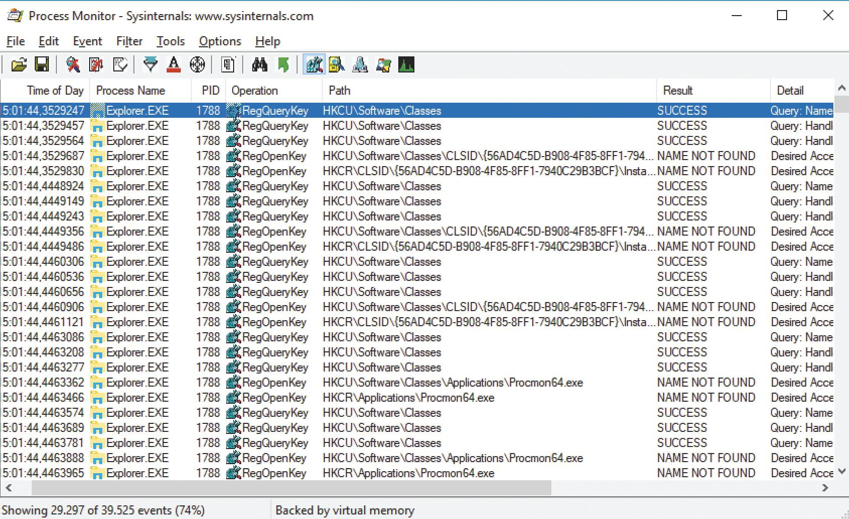 Je moet wel even je weg vinden in het programma. Zo bevat de werkbalk afgezien van de bekende pictogrammen voor openen en opslaan allerlei knoppen die je niet in andere programma’s aantreft. Bovendien zijn Windows en de geopende toepassingen dermate hyperactief, dat Process Monitor elke seconde honderden gebeurtenissen registreert, zelfs als je als gebruiker helemaal niets doet. Ga je de pc daadwerkelijk gebruiken, dan levert dat al snel een stortvloed van honderdduizenden of zelfs miljoenen gebeurtenissen op. Zulke hoeveelheden kun je niet zomaar bekijken en analyseren.