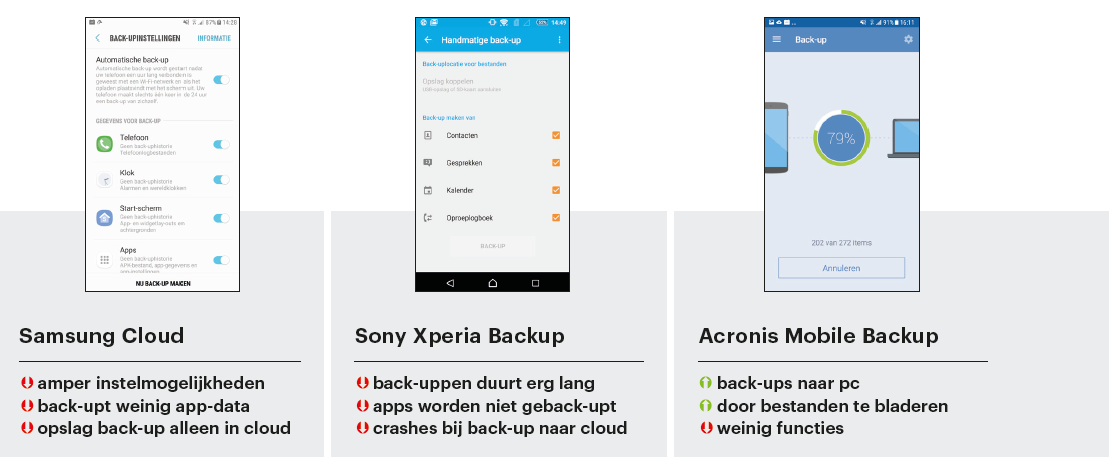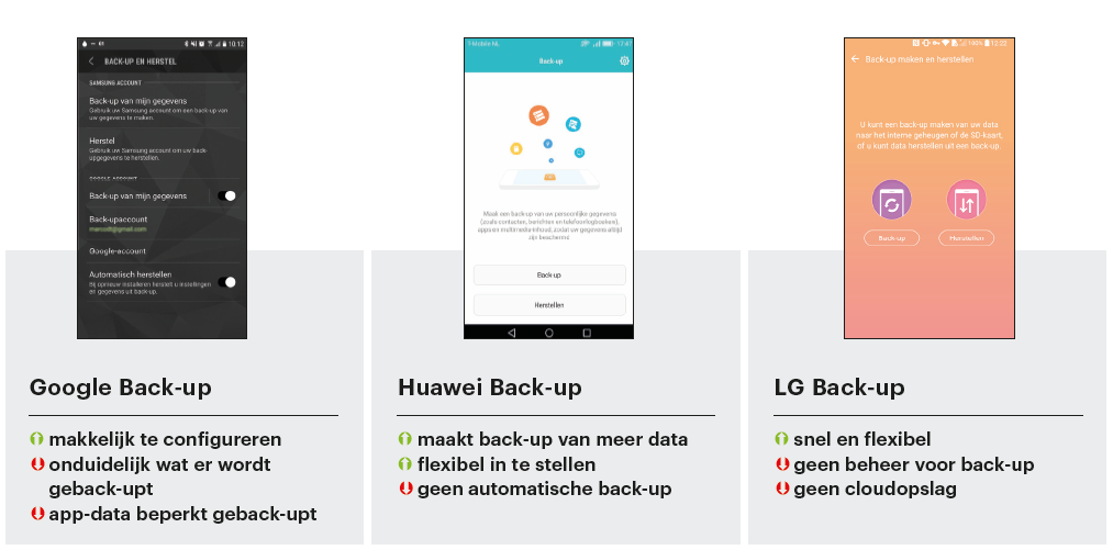 Er blijft echter ruimte voor verbetering, want je kunt niets beïnvloeden en je weet ook niet wat er wordt geback-upt. Daarnaast willen sommige gebruikers zo weinig mogelijk persoonlijke gegevens bij Google achterlaten, waardoor ze de apps en standaardoplossingen van Android vermijden. Daarin liggen kansen voor de eigen back-uptools van smartphone- fabrikanten.