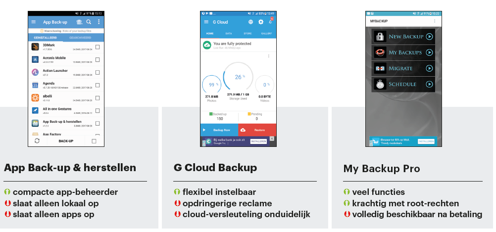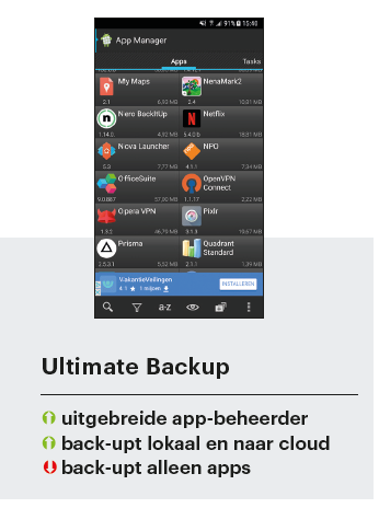 Vind je dat dus wel belangrijk, dan moet je gaan voor een alternatieve launcher als Nova Launcher. Meestal is daarin een eigen back-upfunctie verwerkt die alle look-and-feel-instellingen op de sd-kaart of in een cloud zet. De basisomvang van de tools die wij hebben bekeken, is gelijk: foto’s, video’s, muziek, contacten en sms-berichten werden bij alle apps geback-upt.