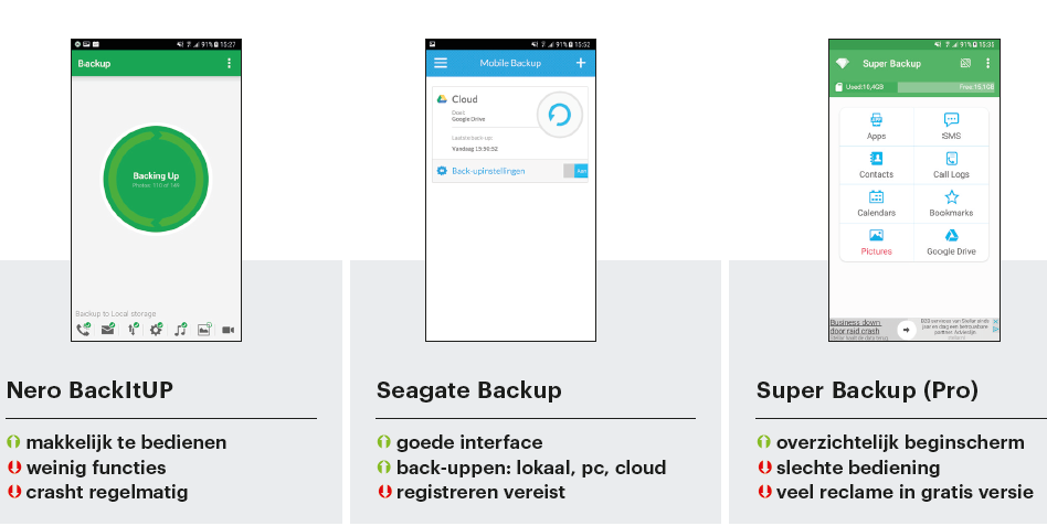 De oplossing is een andere app van de ontwikkelaar die vol staat met opdringerige reclame. Heb je wel vertrouwen in populaire diensten als Dropbox of Drive, dan kun je je data het best naar de sd-kaart back-uppen en ze van daaruit in de cloud zetten. My Backup Pro en Seagate Backup kunnen dat ook automatisch voor je doen.