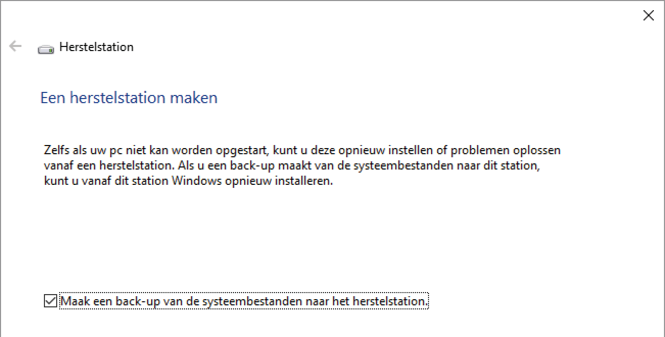 In de volgende stappen wordt de stick compleet gewist. Zorg er dus voor dat er geen belangrijke data meer op staan! Druk op de Windows-toets en typ ‘Herstel’ in totdat je de optie ‘Een herstelstation maken’ ziet verschijnen. Nadat je dat hebt geselecteerd, verschijnt er een wizard. Verwijder het vinkje voor ‘Maak een back-up van de systeembestanden naar het herstelstation’ en klik op ‘Volgende’. Let erop dat ook echt de usb-stick is geselecteerd en laat de wizard zijn werk doen. Indien je de vraag krijgt of de nieuw geconfigureerde partitie geformatteerd moet worden, moet je die afwijzen. Anders wordt juist datgene weer gewist wat net naar de stick werd gekopieerd.