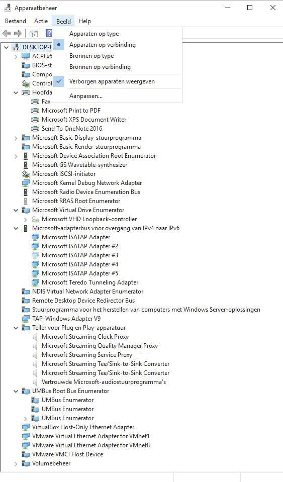 Als je via het menu-item Beeld kiest voor ‘Apparaten op verbinding’ en de boomstructuur verder uitklapt door de kleine grijze pijltjes steeds uit te klappen, kun je zien hoe apparaten en poorten met elkaar verbonden zijn.