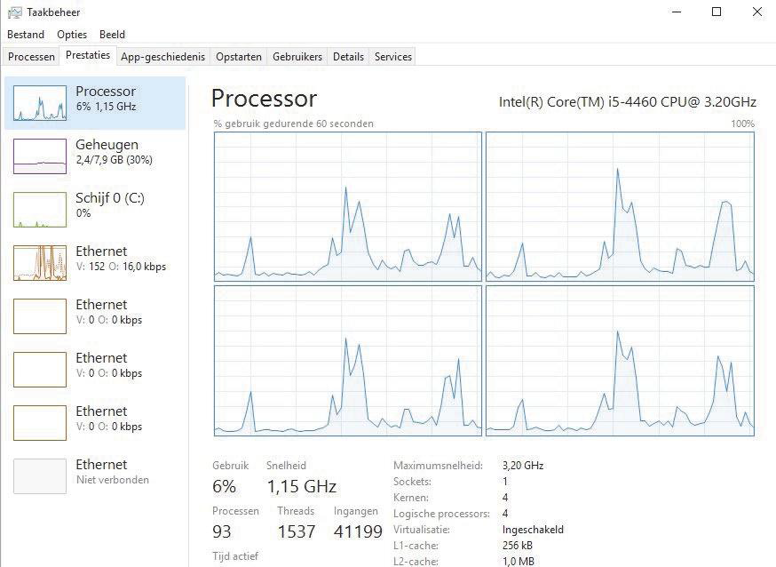 Zo toont Taakbeheer de belasting per losse processorkern en bij processors met Hyper-Threading de belasting per logische kern. Stel dat bij een processor met vier logische kernen de totale belasting zo’n 25 procent is, dan kan dat betekenen dat een single-thread-toepassing een enkele kern volledig belast. Taakbeheer laat je echter vrijwel nooit een belasting van 100 procent zien, maar een meer random verdeling. Dat ligt aan het feit dat op een systeem al honderden threads draaien zonder belasting (dat is ook te zien).