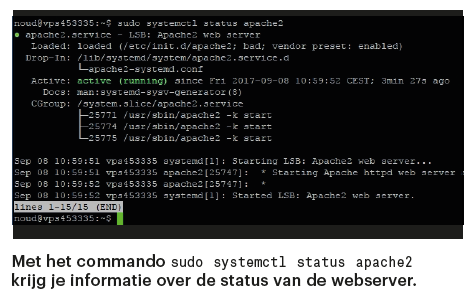 Met het volgende commando krijg je een statusoverzicht van de webserver. Als achter ‘Active’ in het groen ‘active (running)’ staat, is de webserver geactiveerd.